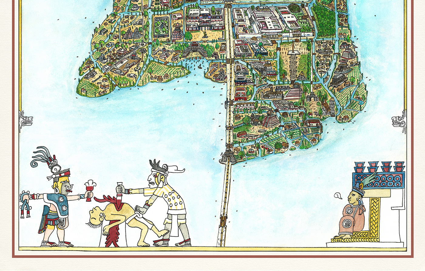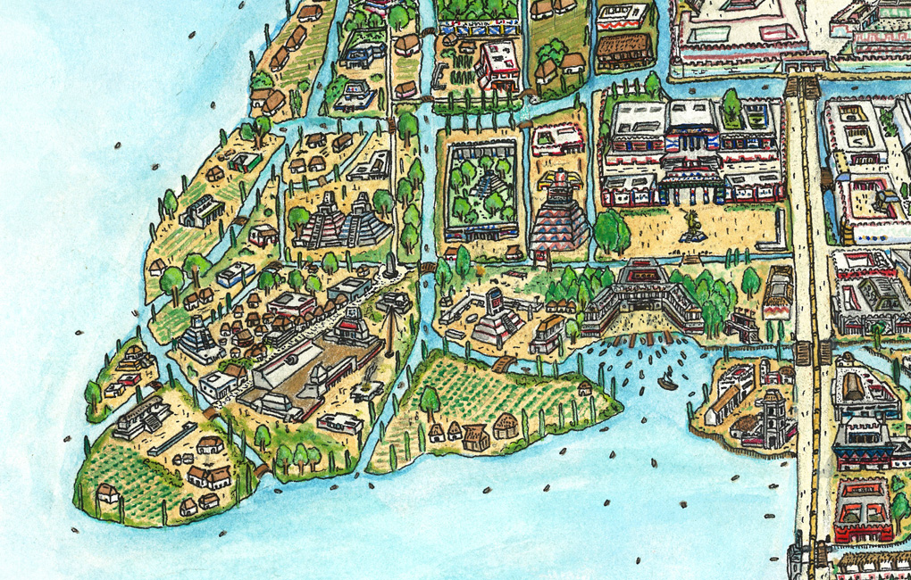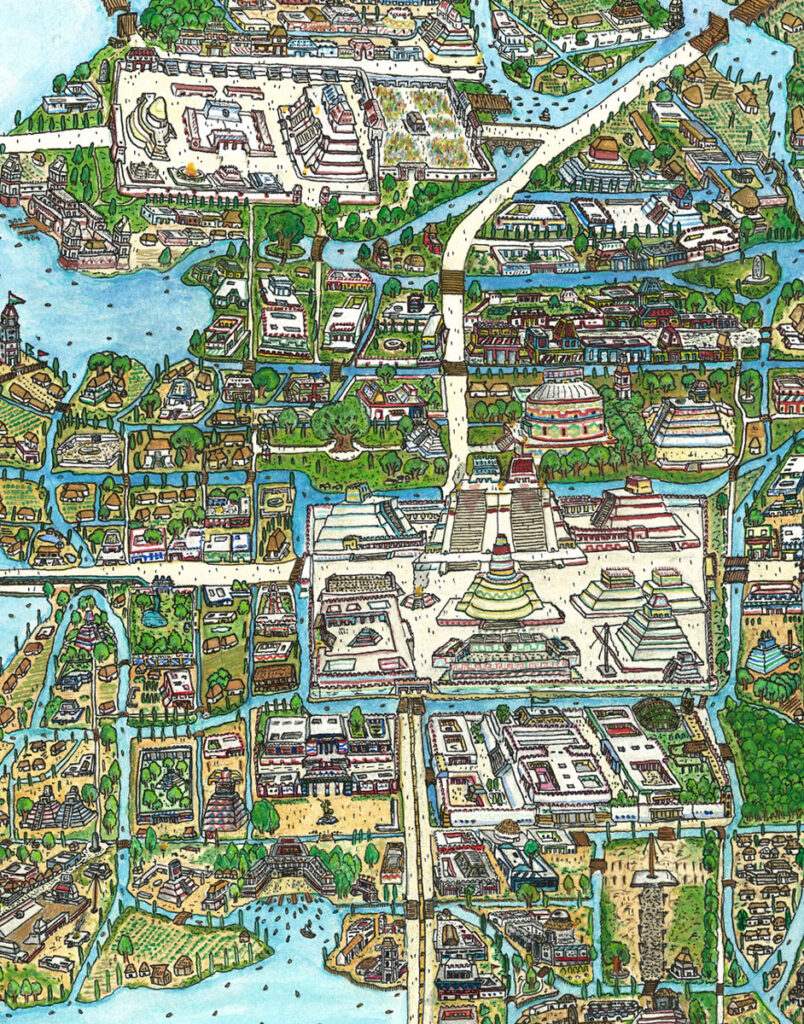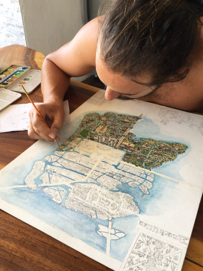 After a long investigation about the location of the Mexica’s buildings in history books and museums, It’s when I started drawing on pencil the sketch of the city, then coloring with watercolor and finally retouching the edges with Technical pen.