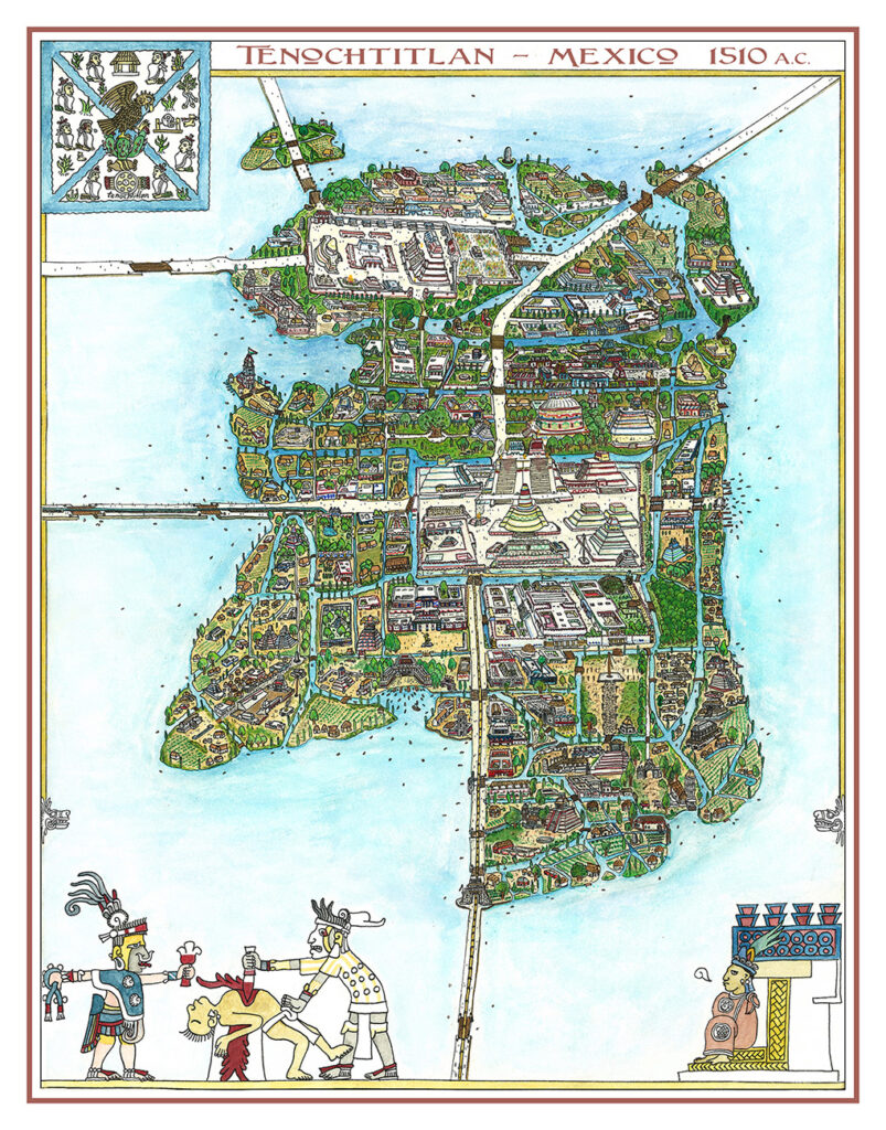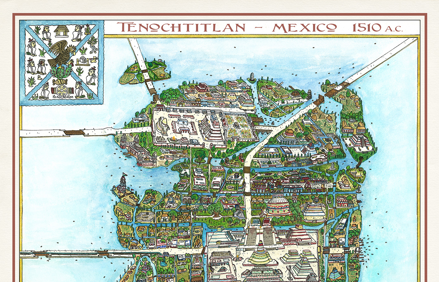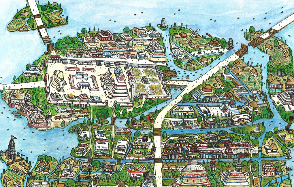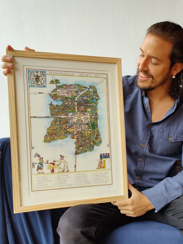 After a long investigation about the location of the Mexica’s buildings in history books and museums, It’s when I started drawing on pencil the sketch of the city, then coloring with watercolor and finally retouching the edges with Technical pen.