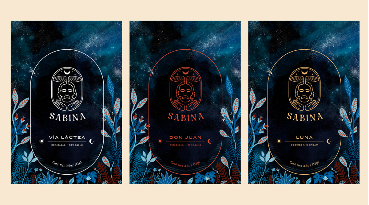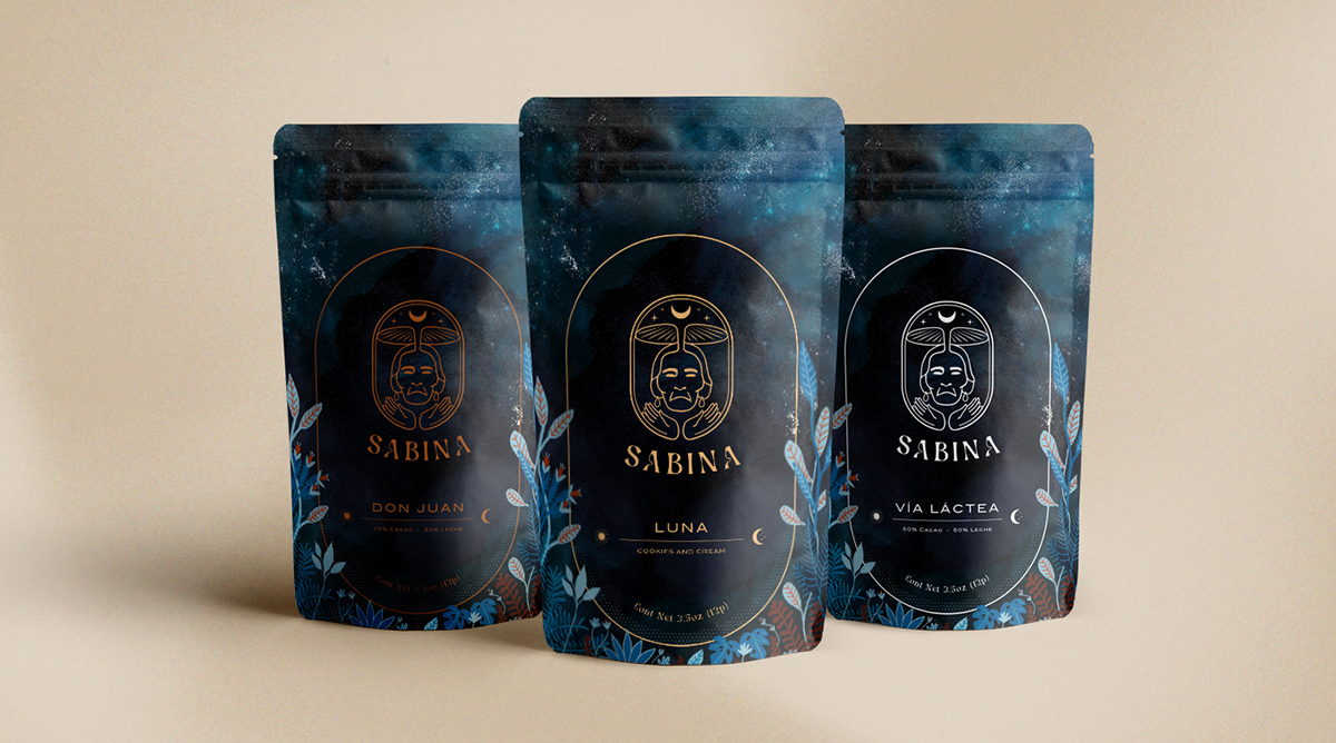The name Sabina is associated refers to María Sabina Magdalena García, Oaxacan healer and shaman, master of ancient healing wisdom of hallucinogenic mushrooms. The combination of this «medicine» mixed with chocolate has been booming recently due to its wonderful effects on the human brain. The visual identity is inspired in a cosmic journey (Stars, galaxies) at the same time anchored to Mother Earth (Medicinal plants).